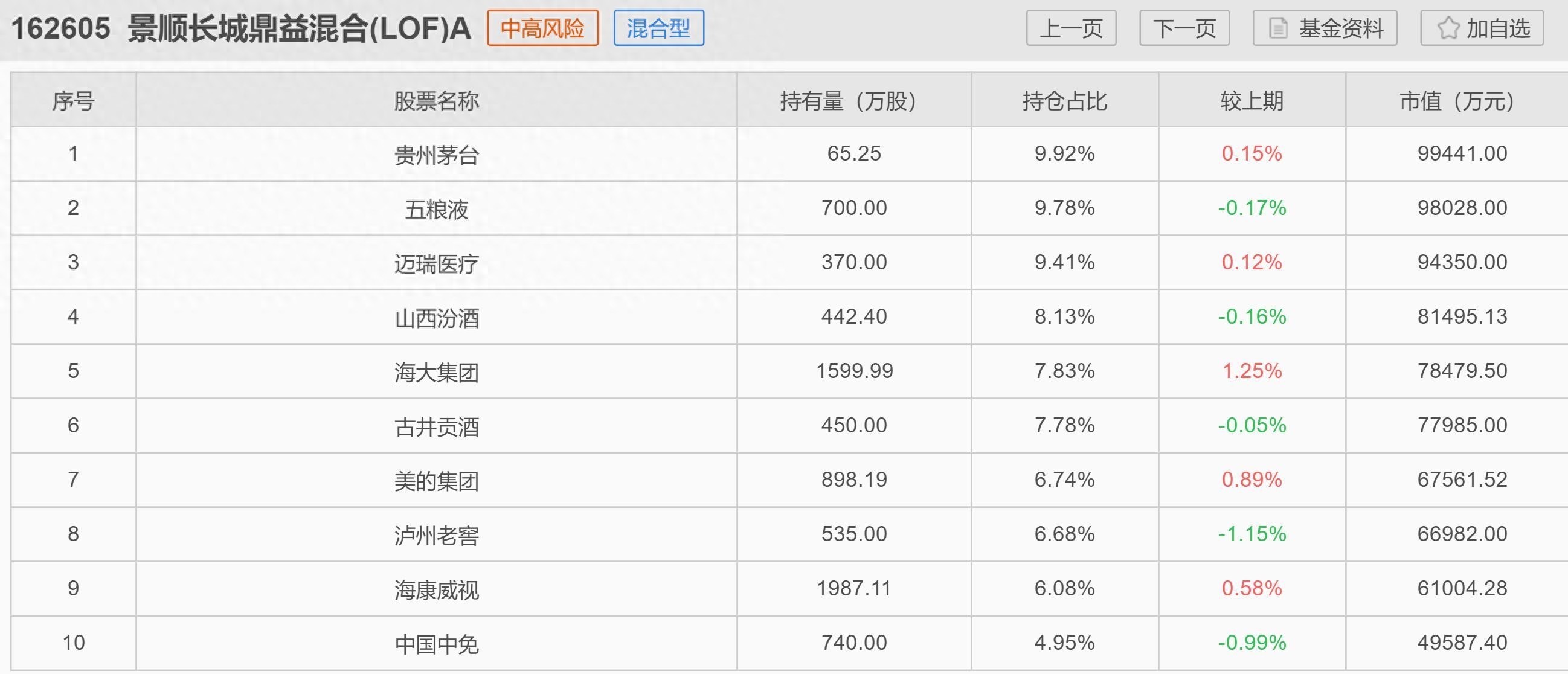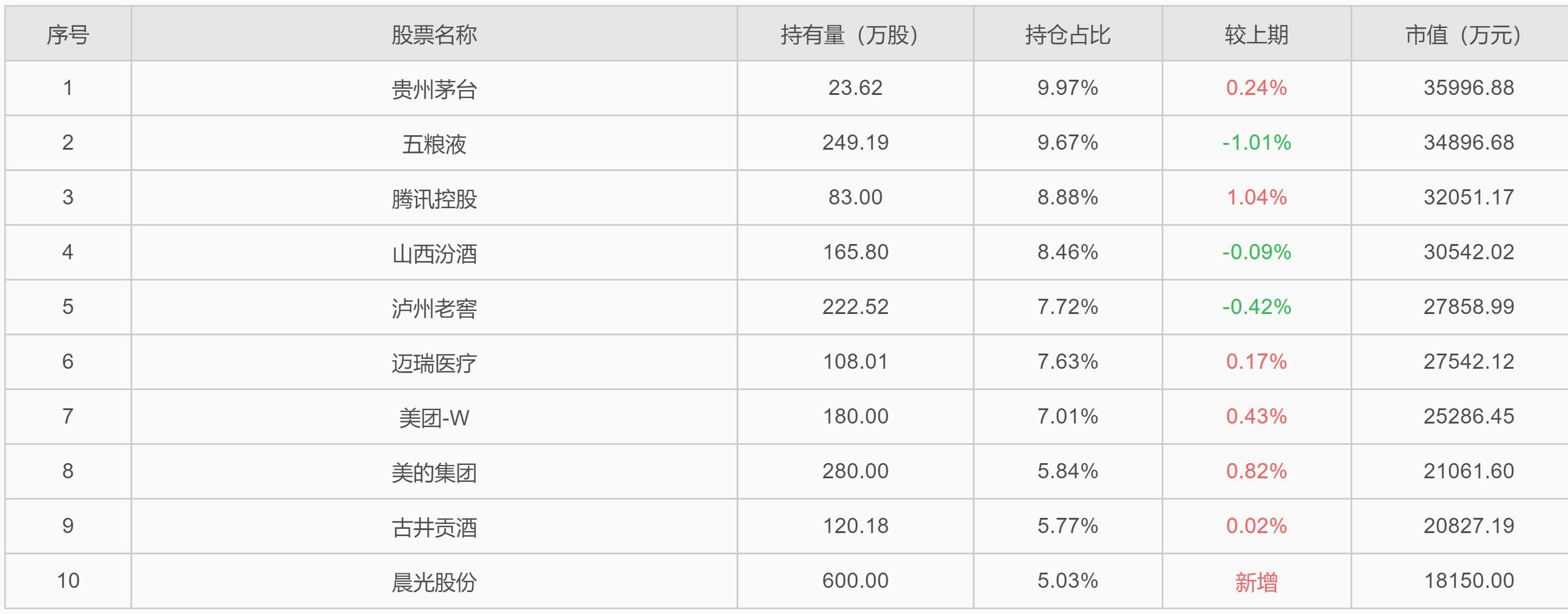 重仓股方面,该基金前十大重仓股分别为贵州茅台(600519.SH)、五粮液、迈瑞医疗(300760.SZ)、山西汾酒(600809.SH)、海大集团(002311.SZ)、古井贡酒(000596.SZ)、美的集团(000333.SZ)、泸州老窖、海康威视(002415 .SZ)、中国中免。