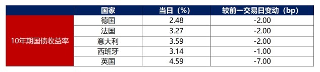 1月21日,主要欧洲经济体10年期国债收益率普遍下行。其中,德国10年期国债收益率下行2bp至2.48%,法国、意大利、西班牙、英国10年期国债收益率分别下行2bp、2bp、1bp和7bp。