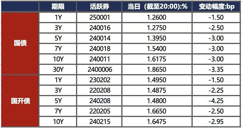1月21日,受特朗普上台政策不及预期影响,早盘债市延续弱势,但随着人民币汇率走强,市场降准降息预期再起,加之资金面边际转松,债市转而走强。截至北京时间20:00,10年期国债活跃券240011收益率下行3.00bp至1.6175%,10年期国开债活跃券240215收益率下行2.95bp至1.6475%。